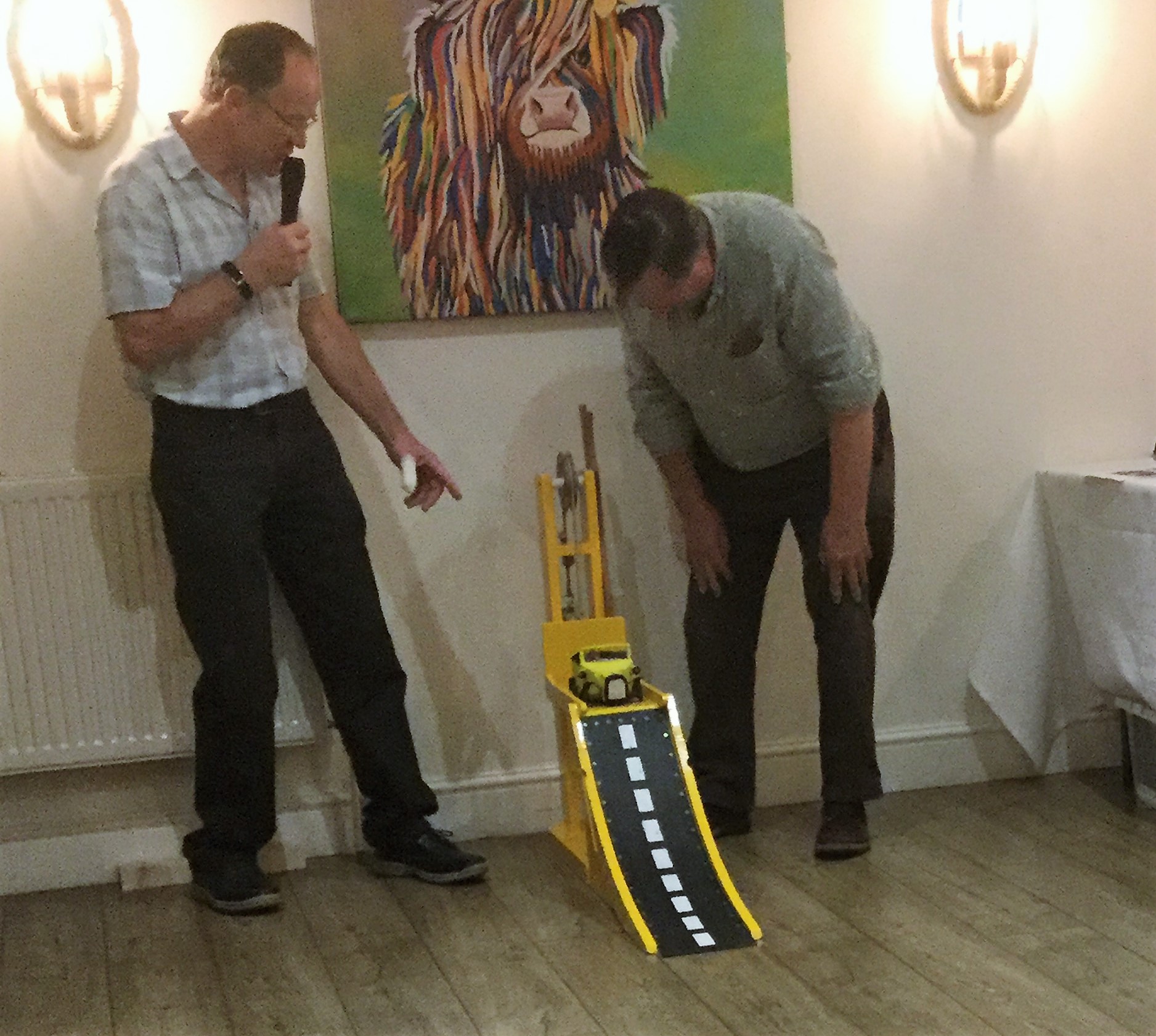 Members were given some rules for their models – Maximum length 12 inches, width 6 inches, weight limit 8oz. No metal in the construction, no use of 3D printers!, so only wood, plastic, paper,card, glue, tape to be used.On the night – 25 homemade models appeared in various guises, shapes and lengths. All scrutinised to ensure they were within the weight and length limits. A metal detector was even used. A purpose built starting ramp was used with a customised launch pad so that each model was released at the same speed.