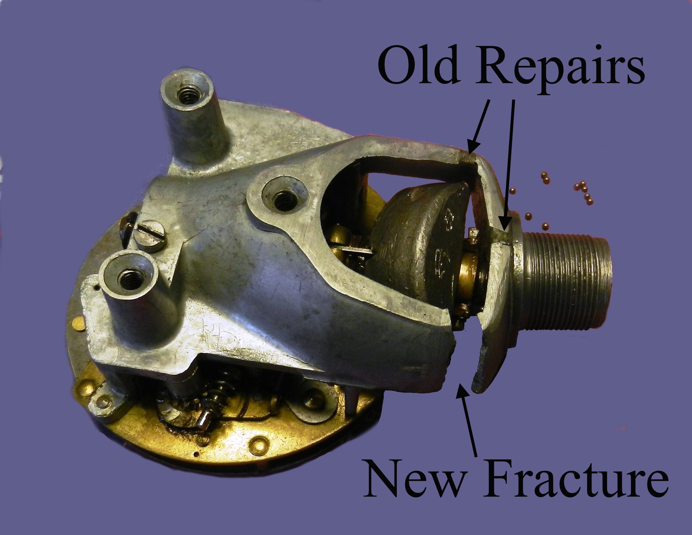 It would appear that the area of the lower casting is a problem area, as this had already been broken twice on this unit, and comments from other members indicate that the ball bearings falling free is a common occurrence. As this can only be caused by excess clearance in the adjustable bearings the frame fracture may be a design weakness in these Smiths speedometers hence my experience may prove useful to others.