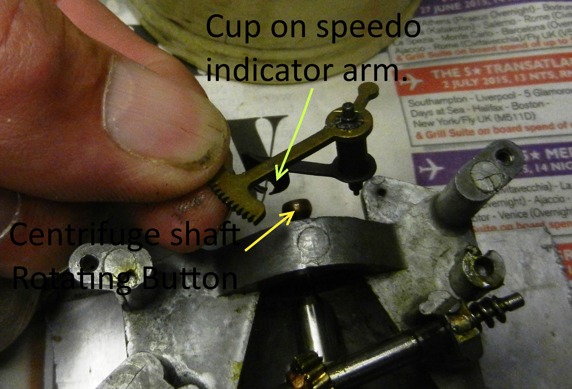 8. At this point check the run-out of the brass button in the speedo arm cup. Any run-out will give fluctuations on the hand whilst registering vehicle speed.