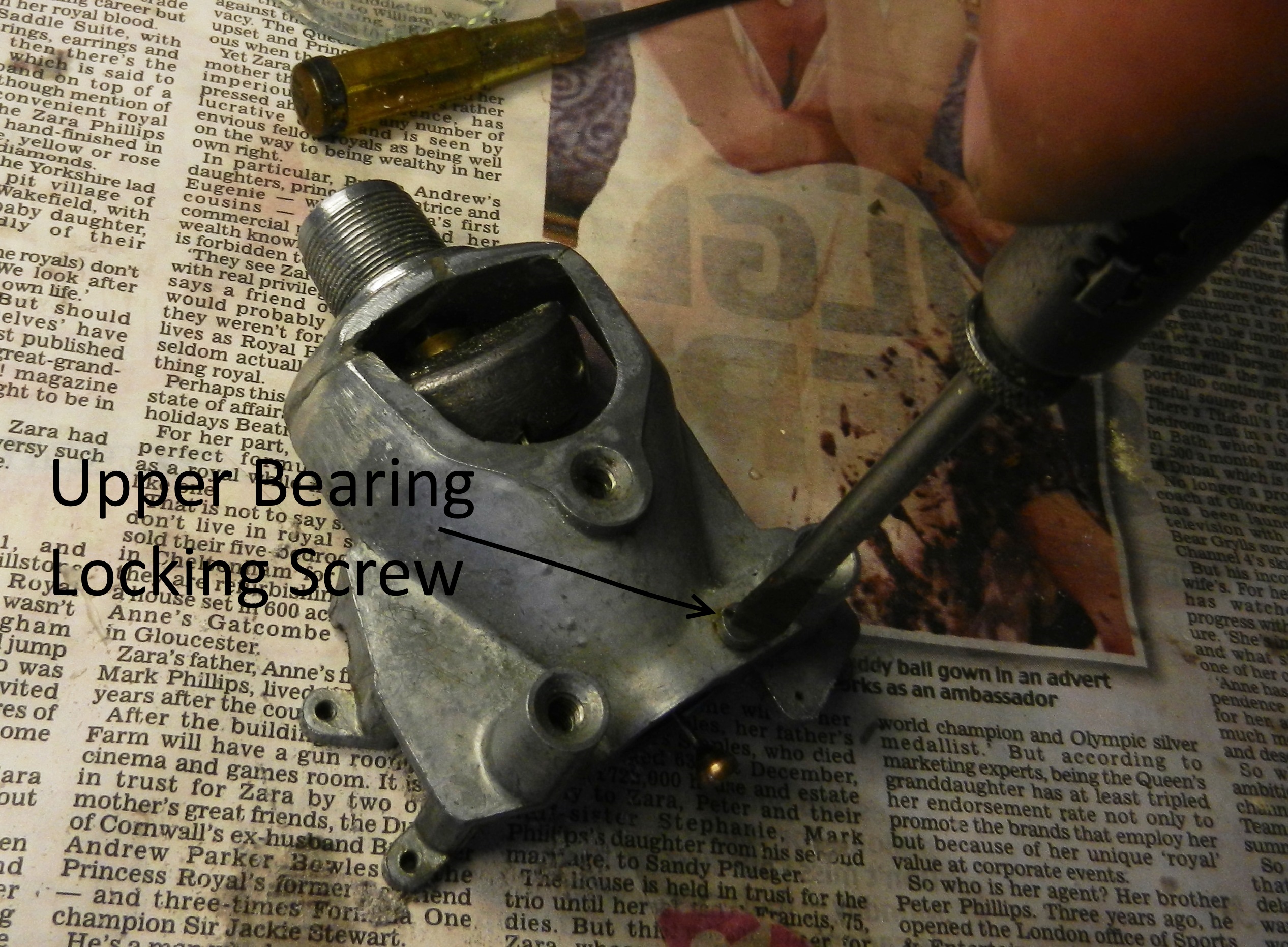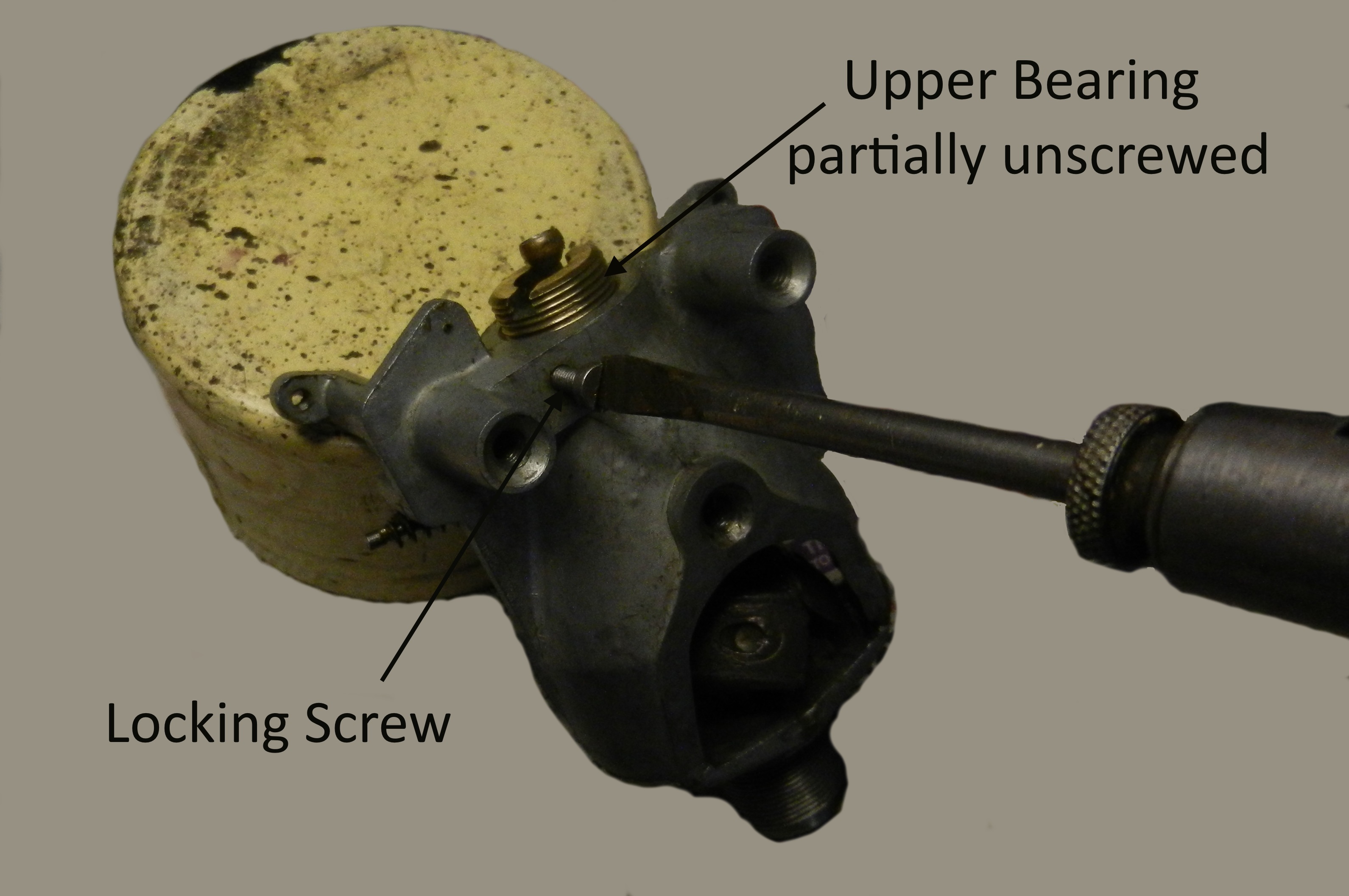 11. The upper bearing can now be unscrewed. Again care to be taken that no balls are lost, they are very difficult to find if inadvertently dropped