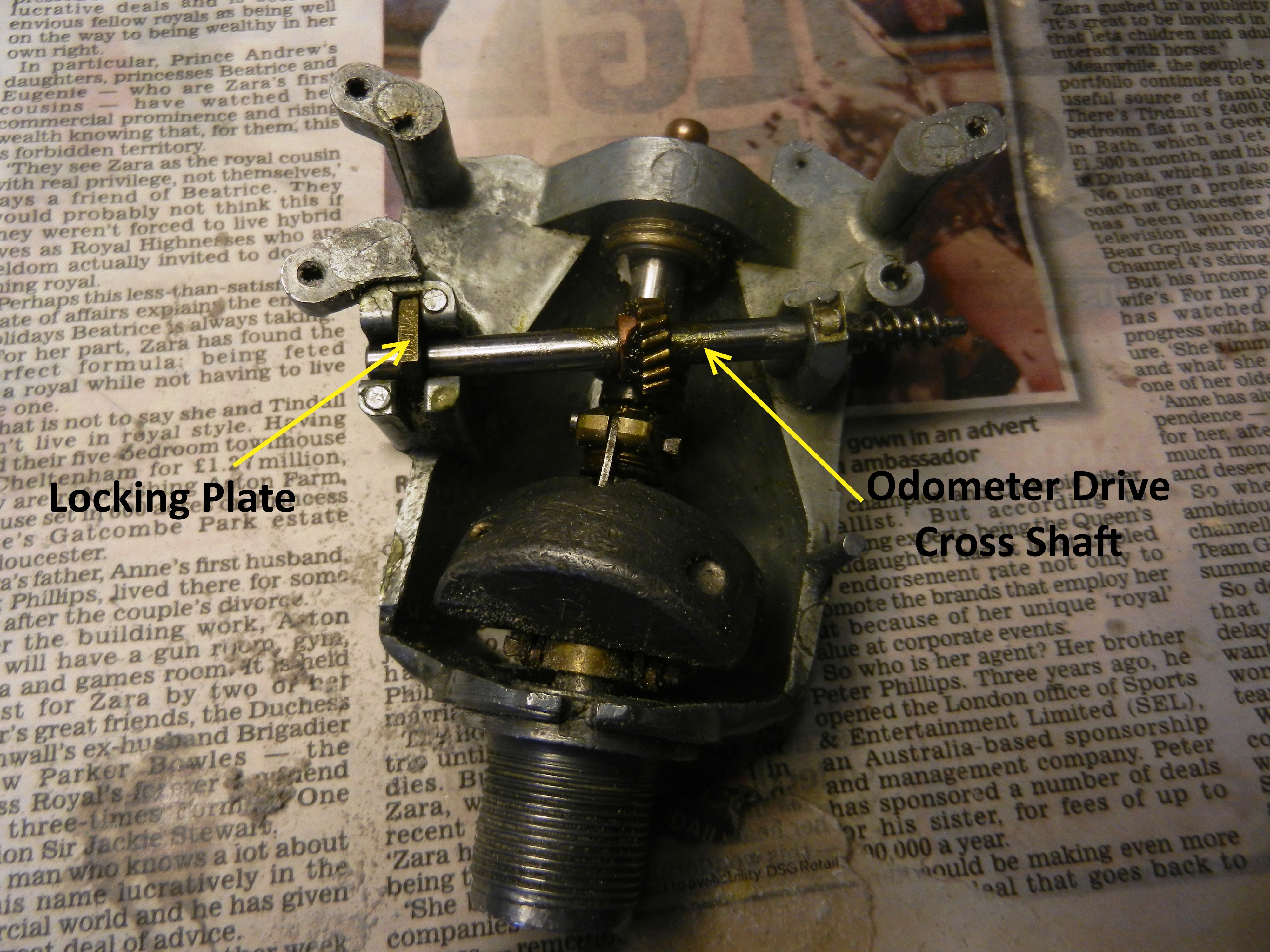 4. Install odometer cross shaft in position, locking in place with the brass key plate